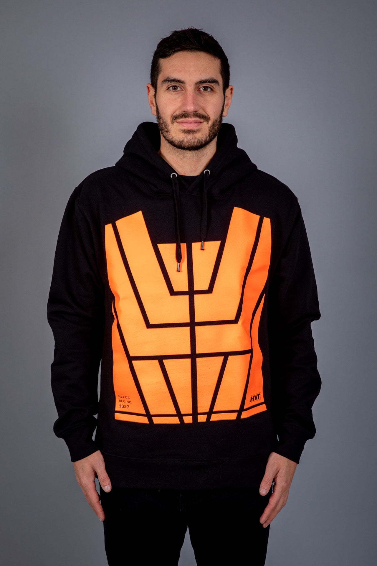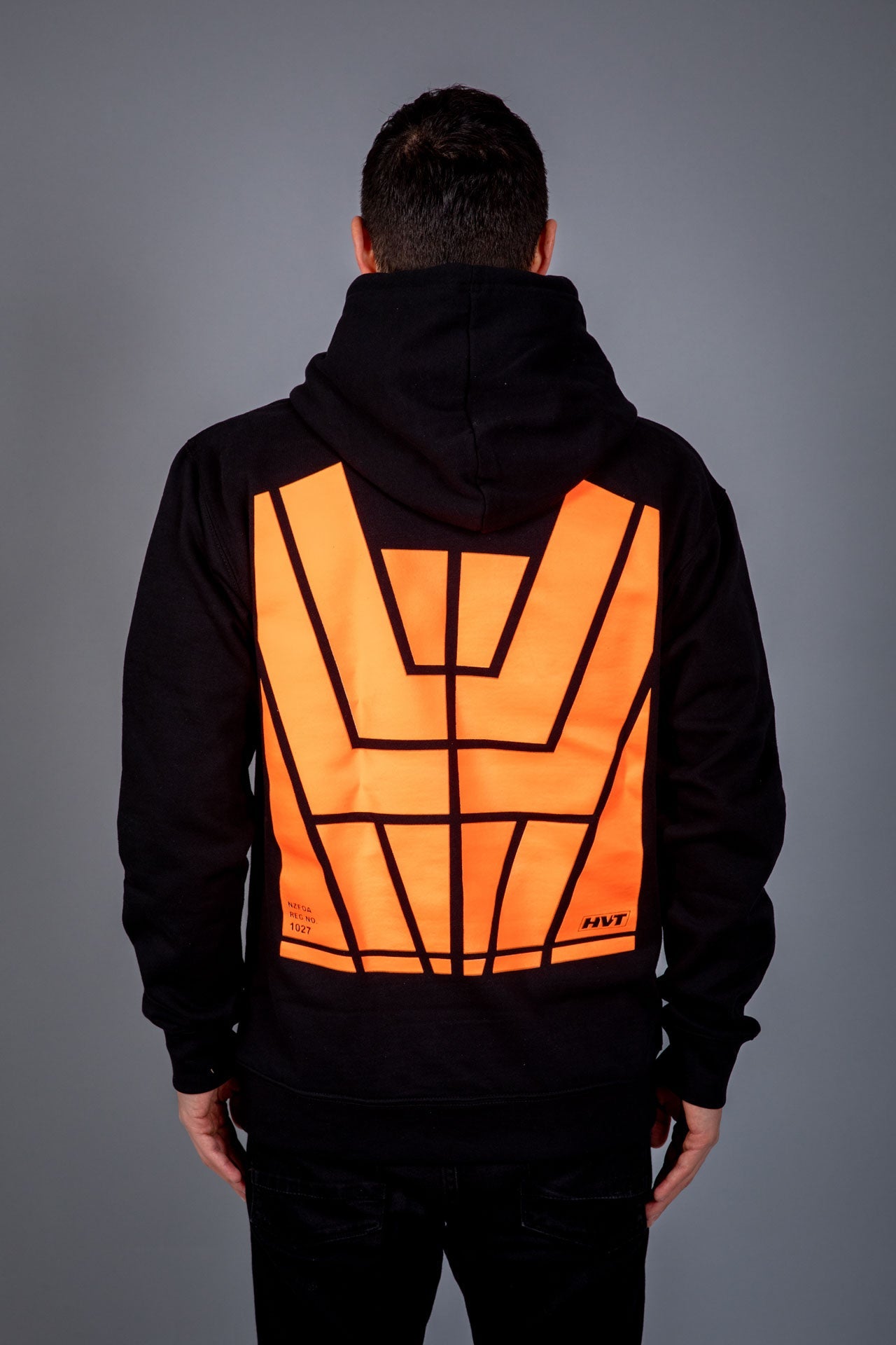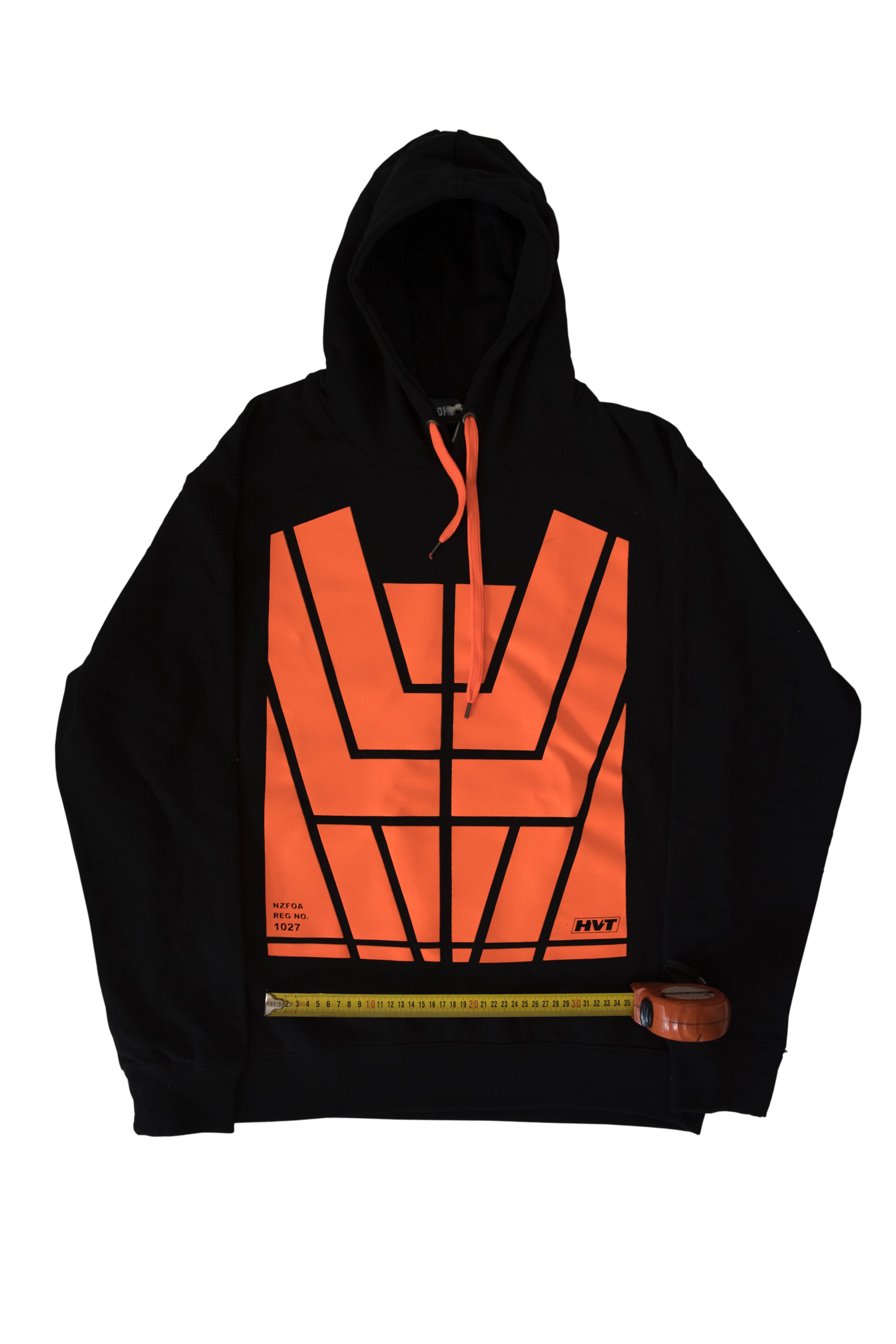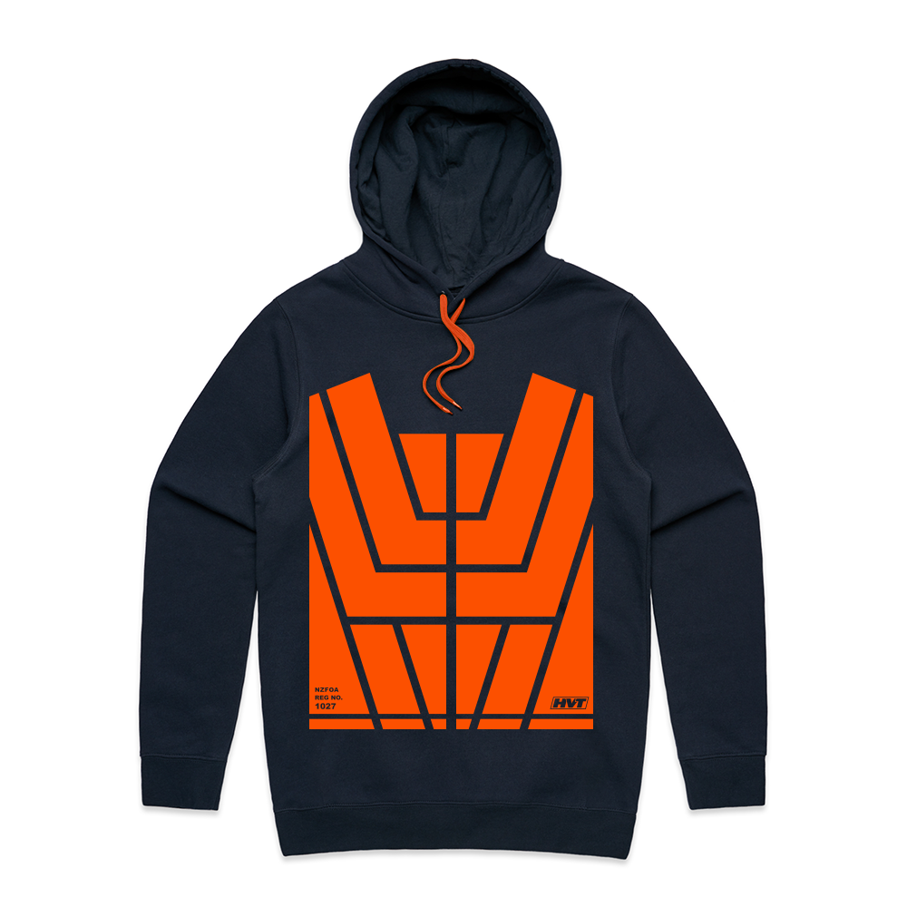 The NZFOA number is in the left-hand corner of the design and the HVT-[Hi-Vis Trends] small logo on the right hand side in the design.