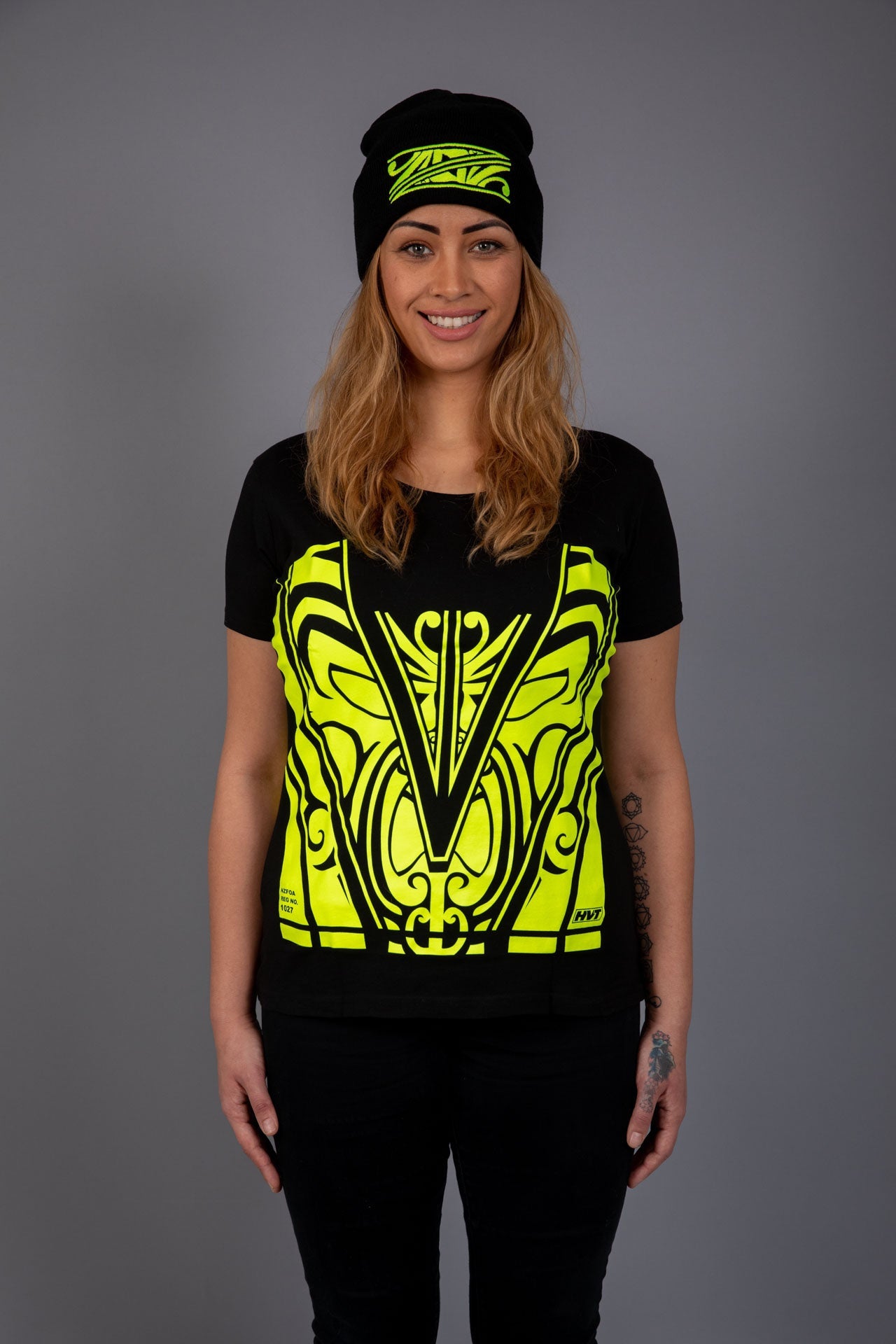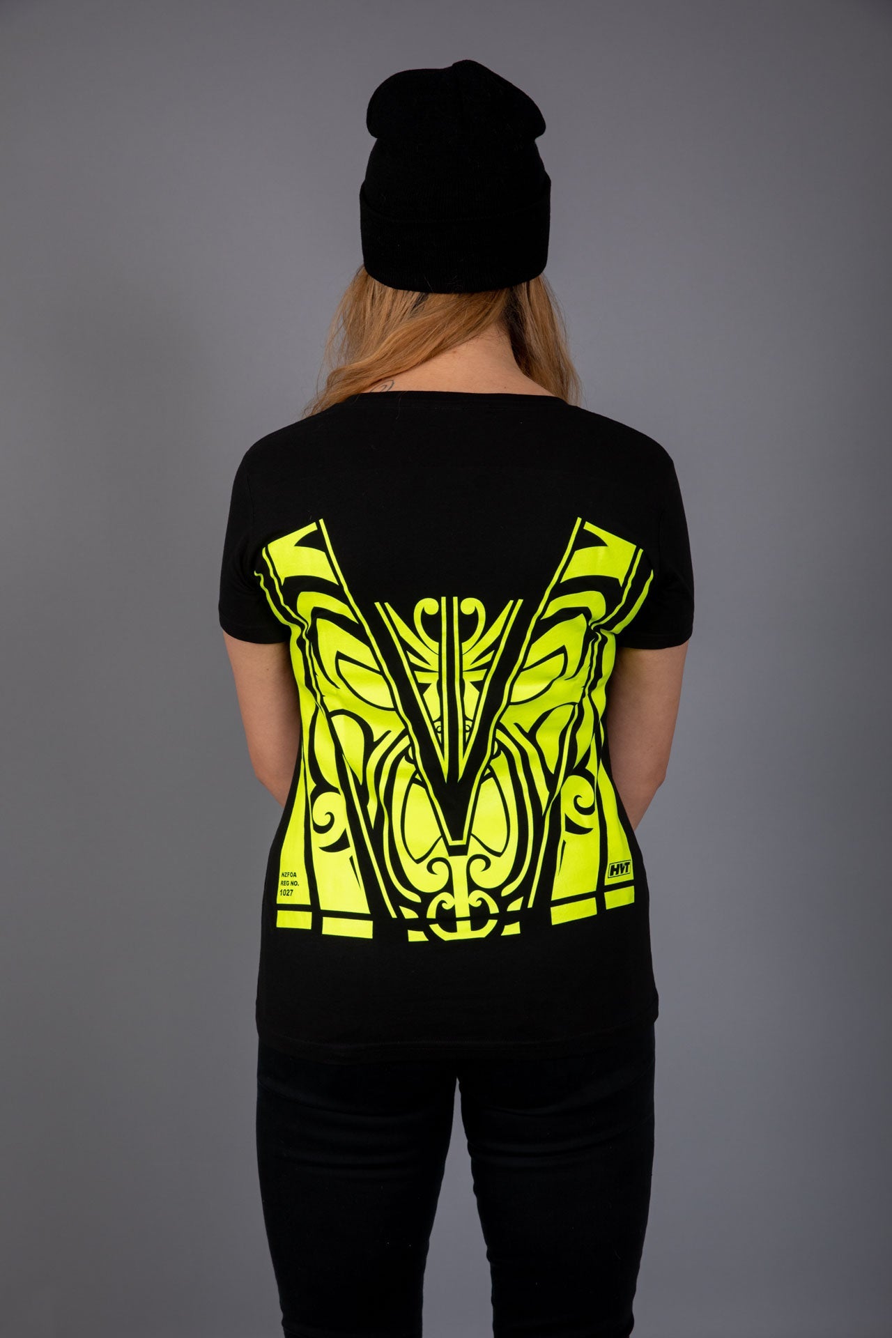 The NZFOA number is in the left-hand corner of the design and the HVT-[Hi-Vis Trends] small logo on the right hand side in the design.