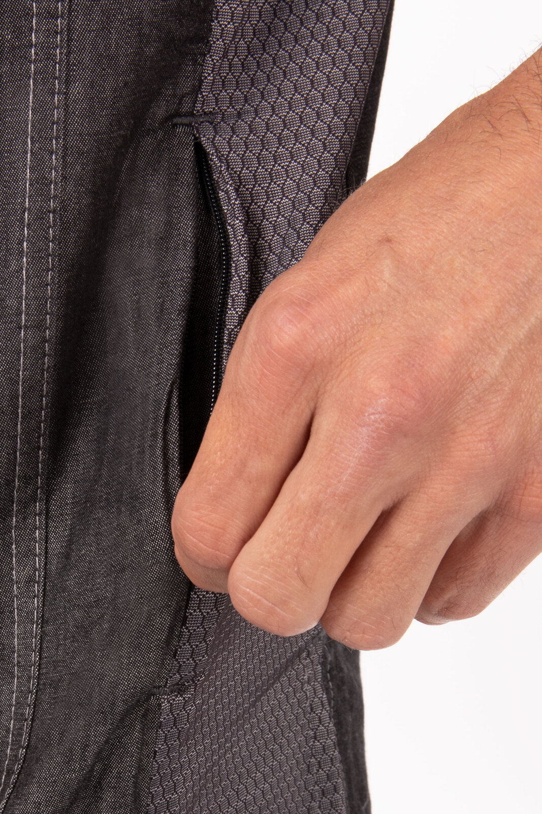 Worthy of an artist's brush, the Tribeca Chef Jacket lets you curate your kitchen with executive style and executive efficiency. Capturing the cosmopolitan spirit of the triangle below Canal Street, this Jacket demands excellence. Available in black only 100% Cotton 163 g S-3XL Stretch back and side panels Short sleeves Single-breasted with snap closure Back-collar apron holder with engraved snap tap Left sleeve thermometer pocket Right sleeve utility pocket